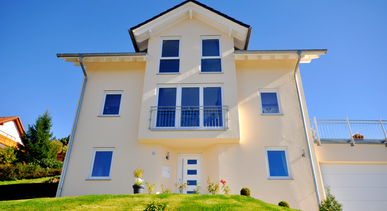 Einfamilienhaus mit zusätzlicher Wohnnutzung im Untergeschoss. Errichtung in Holzständerbauweise mit verputzter Fassade.